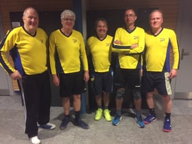 Nach Jahren ohne grosse Erfolge konnte an der diesjährigen Faust-ballnacht ein schon fast histo-rischer Turniersieg verzeichnet werden. Mit dem Punktemaximum aus 6 Spielen war der Turniersieg in der Kat. B Tatsache. Die erfolg-reiche Mannschaft von links: Louis Kälin, Peter Stüdli, Urs Knöpfel, Andi Messmer und Elmar Tomasi